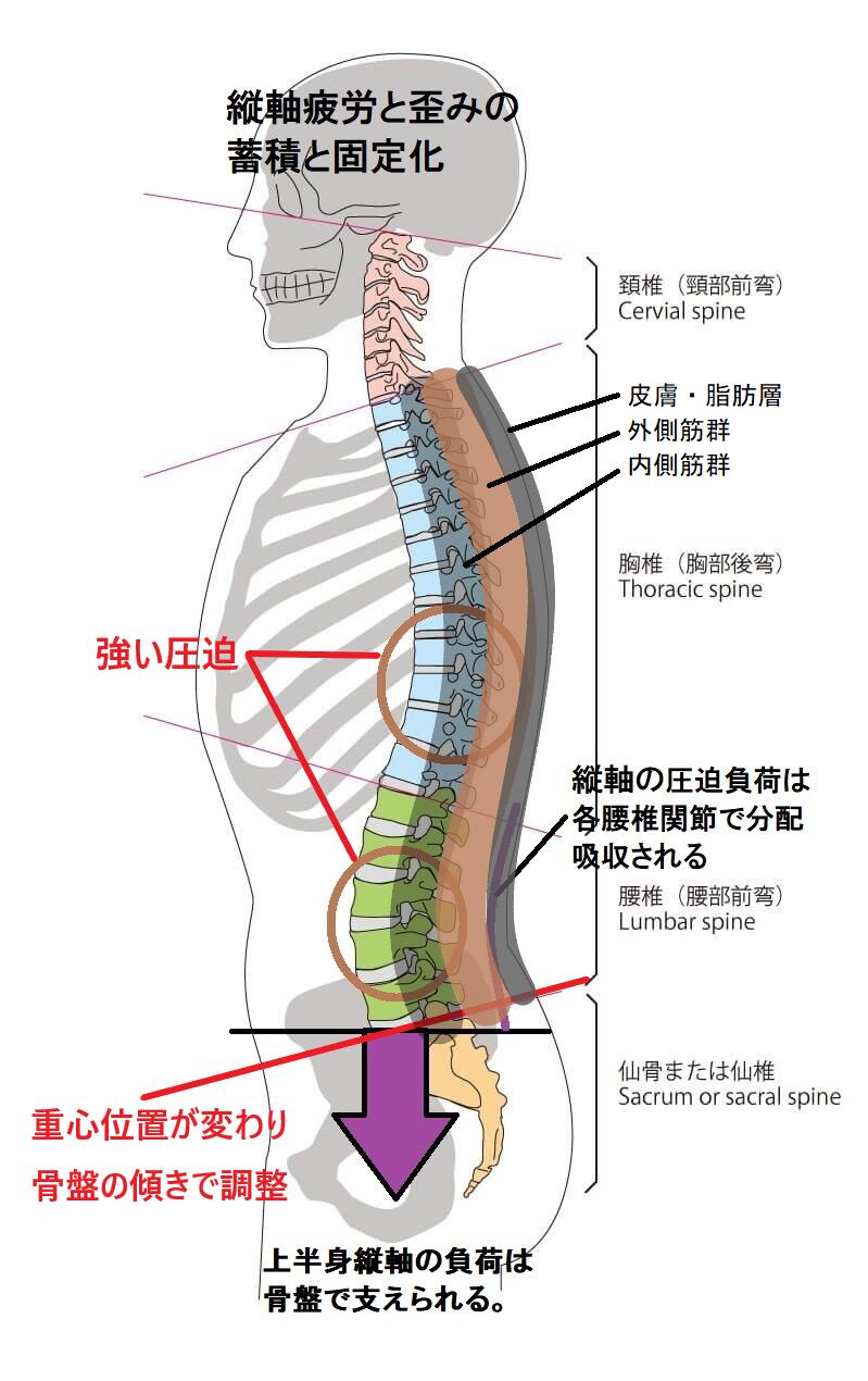 この圧迫負荷は、起立の度に体深部(体芯部)で簡単に繰返されるが、これを支えるのは脊椎構造の基礎的な体力(耐力)しか存在しない。